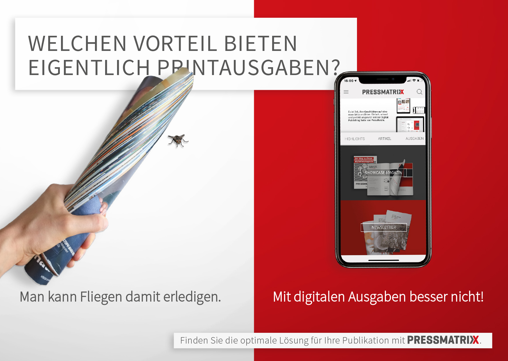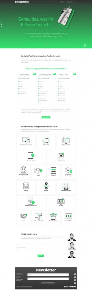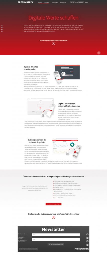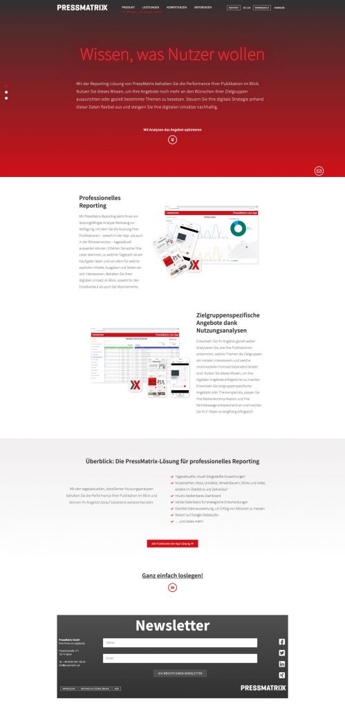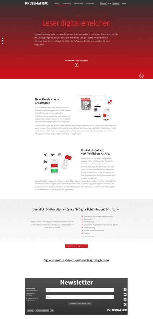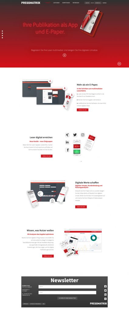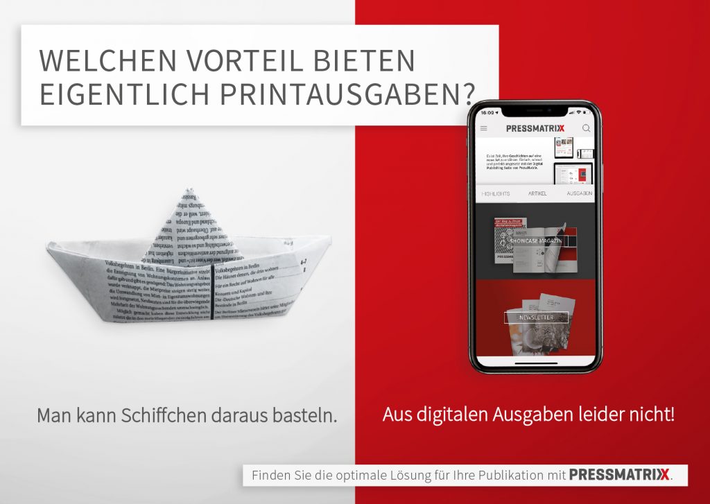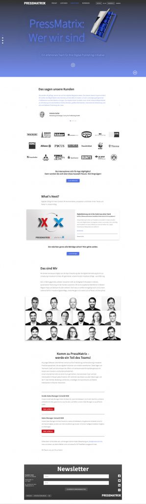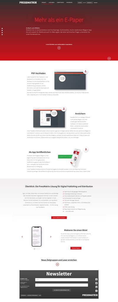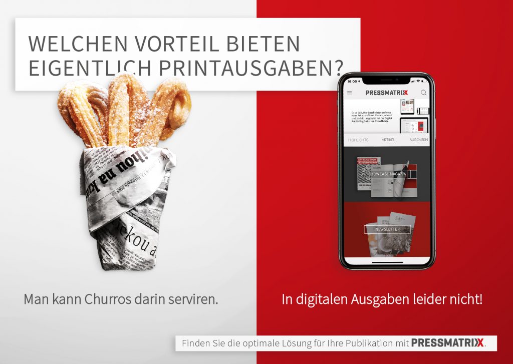 PressMatrix bietet seinen Kunden eine schnelle und einfache Lösung zur Digitalisierung von Print Produkten. Ich habe vier Jahre in dem Softwareunternehmen als Kommunikationsdesignerin gearbeitet. Zu meinen Aufgabenbereichen gehörten Marketing, Grafik und UI/UX. Alle Projekte habe ich von der Ideenfindung – zur Konzeptionierung – bis hin zur Umsetzung betreut.